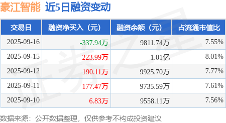 证券之星消息,9月16日,豪江智能(301320)融资买入869.85万元,融资偿还1207.79万元,融资净卖出337.94万元,融资余额9811.74万元,近20个交易日中有14个交易日出现融资净买入。
