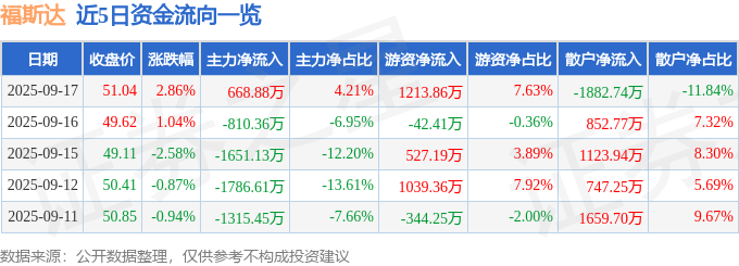 证券之星消息,截至2025年9月17日收盘,福斯达(603173)报收于51.04元,上涨2.86%,换手率6.34%,成交量3.14万手,成交额1.59亿元。