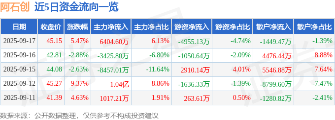 9月17日的资金流向数据方面,主力资金净流入6404.6万元,占总成交额6.13%,游资资金净流出4955.13万元,占总成交额4.74%,散户资金净流出1449.47万元,占总成交额1.39%。