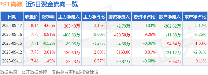 证券之星消息,截至2025年9月17日收盘,*ST海源(002529)报收于8.14元,上涨4.63%,换手率4.64%,成交量12.06万手,成交额9707.32万元。