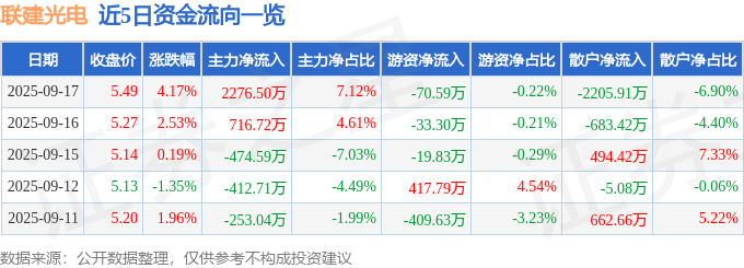 证券之星消息,截至2025年9月17日收盘,联建光电(300269)报收于5.49元,上涨4.17%,换手率11.14%,成交量58.58万手,成交额3.2亿元。
