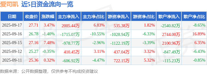 证券之星消息,截至2025年9月17日收盘,爱司凯(300521)报收于27.71元,上涨3.47%,换手率7.05%,成交量10.52万手,成交额2.94亿元。