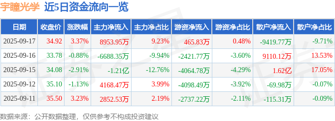 证券之星消息,截至2025年9月17日收盘,宇瞳光学(300790)报收于34.92元,上涨3.37%,换手率8.57%,成交量27.81万手,成交额9.7亿元。
