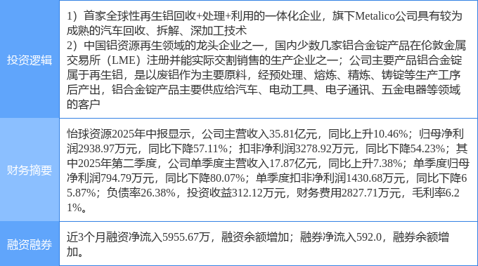该股为有色 · 铝,有色金属,汽车拆解概念热股,当日有色 · 铝概念上涨1.28%,有色金属概念上涨0.58%,汽车拆解概念上涨0.56%。