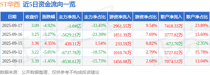 证券之星消息,截至2025年9月17日收盘,ST华西(002630)报收于3.09元,下跌4.92%,换手率9.6%,成交量98.94万手,成交额3.11亿元。