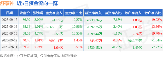 证券之星消息,截至2025年9月17日收盘,舒泰神(300204)报收于36.99元,下跌3.02%,换手率5.59%,成交量25.37万手,成交额9.46亿元。