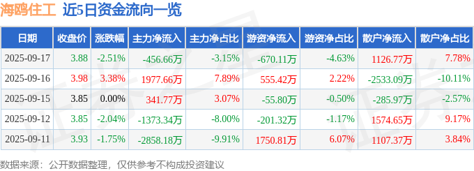 证券之星消息,截至2025年9月17日收盘,海鸥住工(002084)报收于3.88元,下跌2.51%,换手率5.76%,成交量37.11万手,成交额1.45亿元。