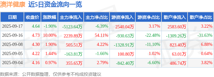 证券之星消息,截至2025年9月17日收盘,澳洋健康(002172)报收于4.64元,下跌1.9%,换手率21.63%,成交量165.55万手,成交额8.02亿元。