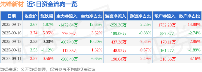 证券之星消息,截至2025年9月17日收盘,先锋新材(300163)报收于3.67元,下跌1.87%,换手率6.94%,成交量31.48万手,成交额1.16亿元。