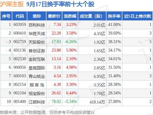 当日沪深主板换手率前10大个股中8只个股收涨,平均涨幅4.06%,其中百利科技(603959)以换手率41.08%排第一,4只个股近5个交易日中多次上榜。