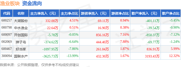 从资金流向上来看,当日渔业板块主力资金净流出4749.45万元,游资资金净流入2079.91万元,散户资金净流入2669.54万元。渔业板块个股资金流向见下表: