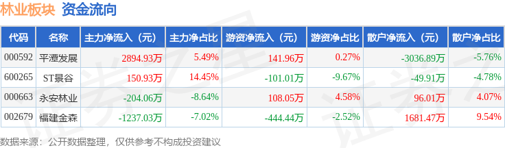 从资金流向上来看,当日林业板块主力资金净流入1604.77万元,游资资金净流出295.45万元,散户资金净流出1309.32万元。林业板块个股资金流向见下表: