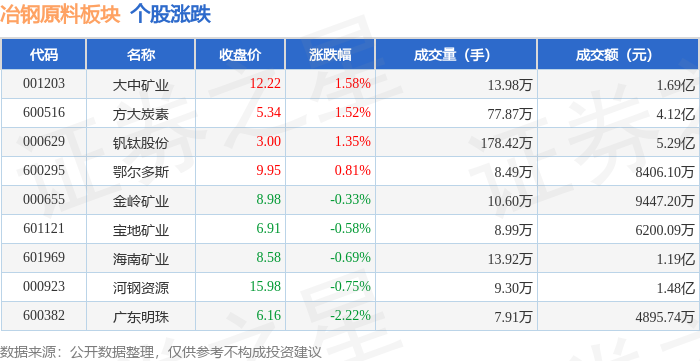 证券之星消息,9月17日冶钢原料板块较上一交易日上涨0.63%,大中矿业领涨。当日上证指数报收于3876.34,上涨0.37%。深证成指报收于13215.46,上涨1.16%。冶钢原料板块个股涨跌见下表: