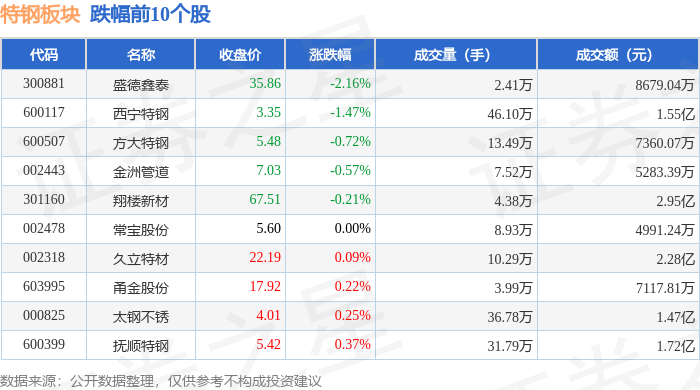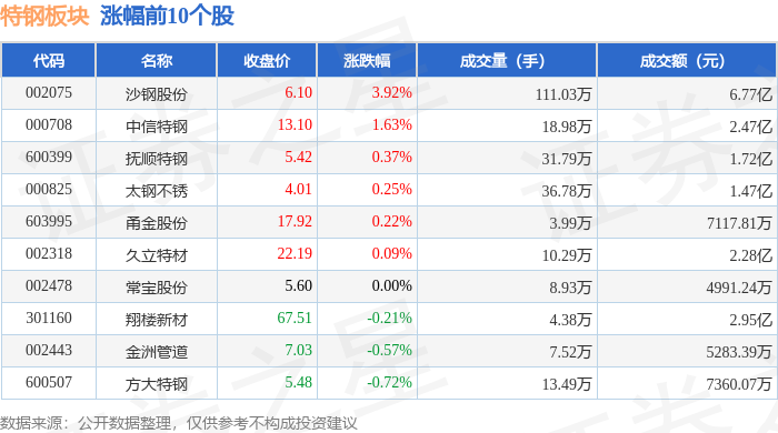 证券之星消息,9月17日特钢板块较上一交易日上涨0.77%,沙钢股份领涨。当日上证指数报收于3876.34,上涨0.37%。深证成指报收于13215.46,上涨1.16%。特钢板块个股涨跌见下表: