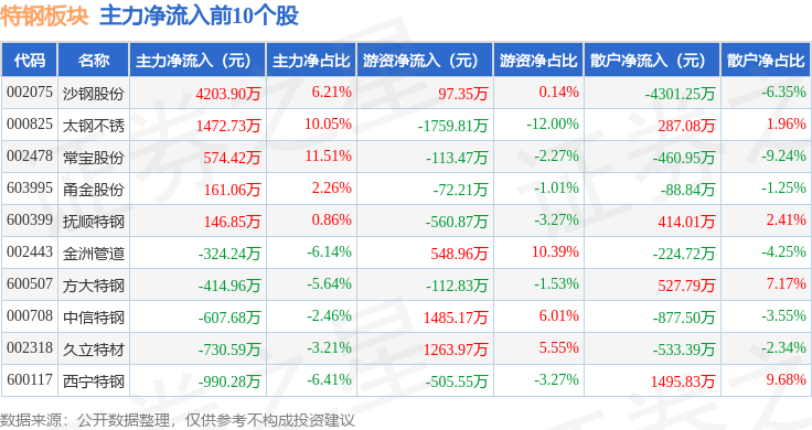 从资金流向上来看,当日特钢板块主力资金净流出1312.05万元,游资资金净流入2899.03万元,散户资金净流出1586.98万元。特钢板块个股资金流向见下表: