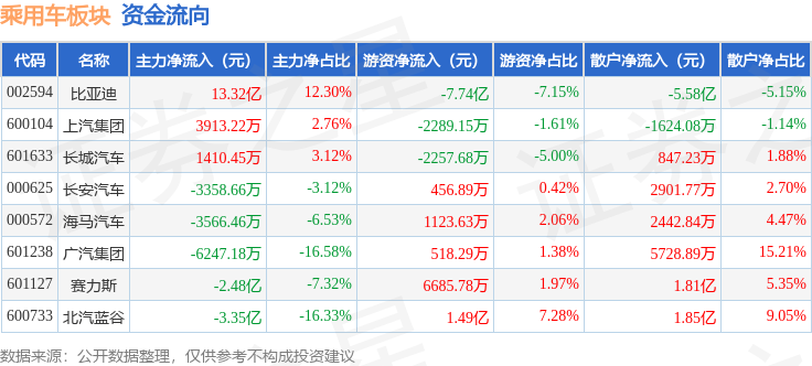 从资金流向上来看,当日乘用车板块主力资金净流入6.7亿元,游资资金净流出5.82亿元,散户资金净流出8818.83万元。乘用车板块个股资金流向见下表: