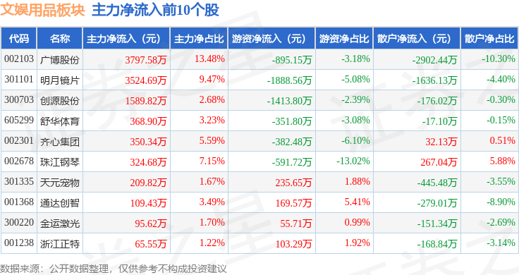 从资金流向上来看,当日文娱用品板块主力资金净流出826.83万元,游资资金净流出2404.34万元,散户资金净流入3231.17万元。文娱用品板块个股资金流向见下表: