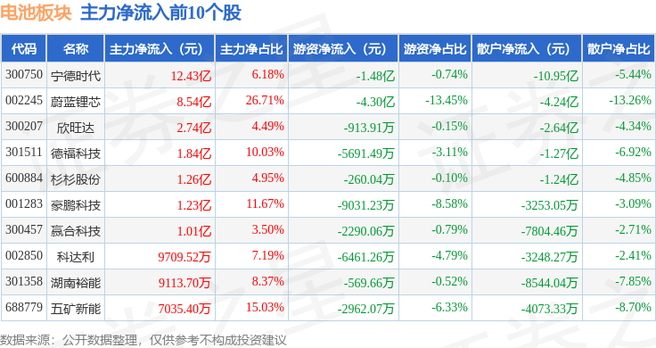 从资金流向上来看,当日电池板块主力资金净流入2.18亿元,游资资金净流出7.68亿元,散户资金净流入5.5亿元。电池板块个股资金流向见下表: