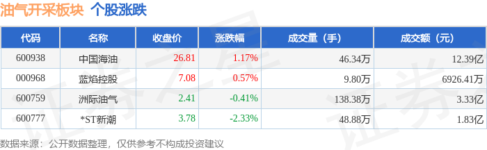 证券之星消息,9月17日油气开采板块较上一交易日上涨0.29%,中国海油领涨。当日上证指数报收于3876.34,上涨0.37%。深证成指报收于13215.46,上涨1.16%。油气开采板块个股涨跌见下表: