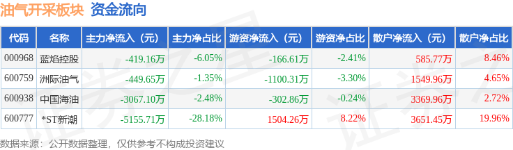 从资金流向上来看,当日油气开采板块主力资金净流出9091.62万元,游资资金净流出65.52万元,散户资金净流入9157.13万元。油气开采板块个股资金流向见下表: