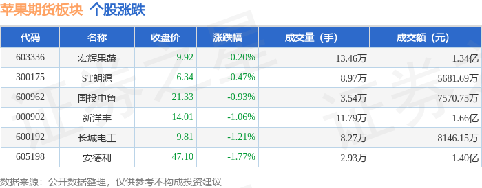 证券之星消息,9月17日苹果期货板块较上一交易日下跌1.11%,安德利领跌。当日上证指数报收于3876.34,上涨0.37%。深证成指报收于13215.46,上涨1.16%。苹果期货板块个股涨跌见下表: