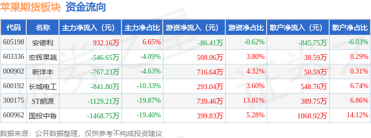 从资金流向上来看,当日苹果期货板块主力资金净流出3821.48万元,游资资金净流入2570.61万元,散户资金净流入1250.87万元。苹果期货板块个股资金流向见下表: