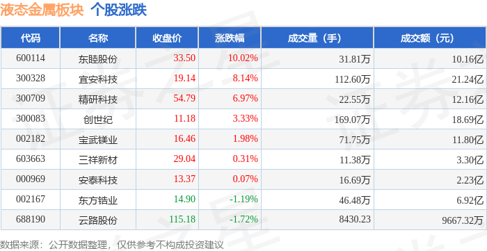 证券之星消息,9月17日液态金属板块较上一交易日上涨3.23%,东睦股份领涨。当日上证指数报收于3876.34,上涨0.37%。深证成指报收于13215.46,上涨1.16%。液态金属板块个股涨跌见下表: