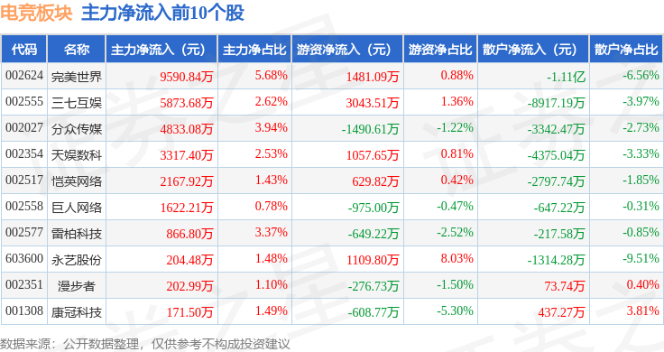 从资金流向上来看,当日电竞板块主力资金净流出5.11亿元,游资资金净流入1.78亿元,散户资金净流入3.32亿元。电竞板块个股资金流向见下表: