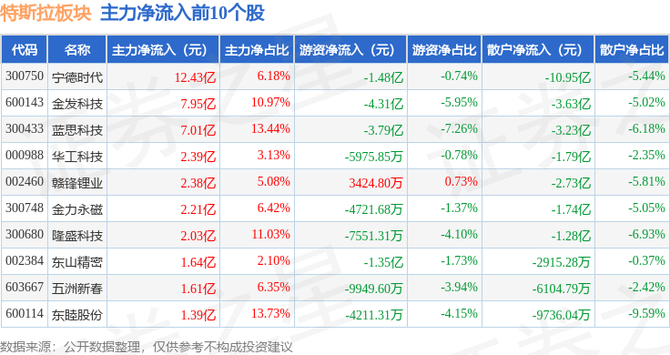 从资金流向上来看,当日特斯拉板块主力资金净流出10.2亿元,游资资金净流出10.13亿元,散户资金净流入20.33亿元。特斯拉板块个股资金流向见下表: