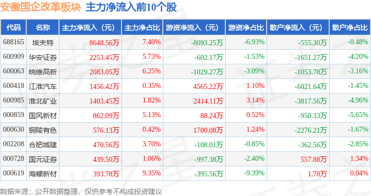 从资金流向上来看,当日安徽国企改革板块主力资金净流出5.25亿元,游资资金净流入5012.36万元,散户资金净流入4.75亿元。安徽国企改革板块个股资金流向见下表: