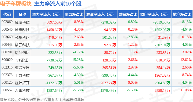 从资金流向上来看,当日电子车牌板块主力资金净流出2.62亿元,游资资金净流入5583.55万元,散户资金净流入2.06亿元。电子车牌板块个股资金流向见下表: