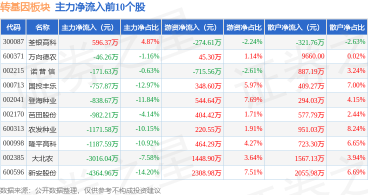 从资金流向上来看,当日转基因板块主力资金净流出1.73亿元,游资资金净流入6654.21万元,散户资金净流入1.07亿元。转基因板块个股资金流向见下表:
