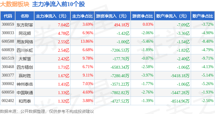 从资金流向上来看,当日大数据板块主力资金净流出66.25亿元,游资资金净流入21.91亿元,散户资金净流入44.35亿元。大数据板块个股资金流向见下表: