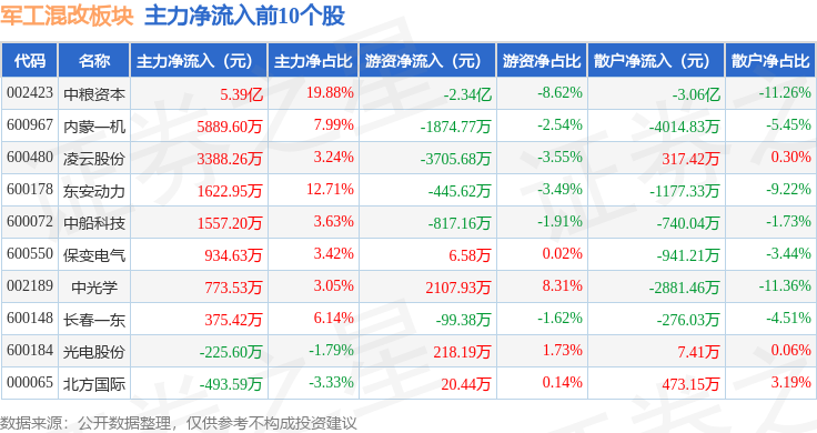从资金流向上来看,当日军工混改板块主力资金净流出3.28亿元,游资资金净流出3.65亿元,散户资金净流入6.92亿元。军工混改板块个股资金流向见下表: