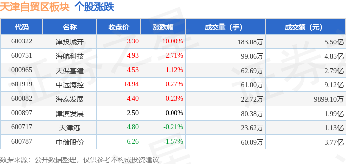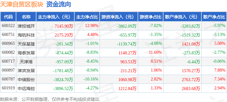 从资金流向上来看,当日天津自贸区板块主力资金净流出2294.39万元,游资资金净流出1060.97万元,散户资金净流入3355.35万元。天津自贸区板块个股资金流向见下表: