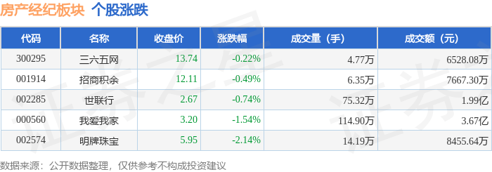 证券之星消息,9月17日房产经纪板块较上一交易日下跌0.93%,明牌珠宝领跌。当日上证指数报收于3876.34,上涨0.37%。深证成指报收于13215.46,上涨1.16%。房产经纪板块个股涨跌见下表: