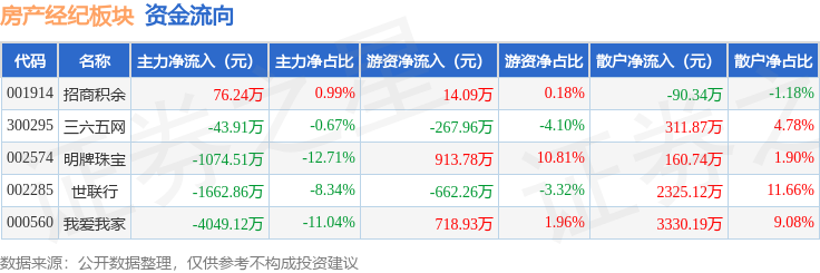 从资金流向上来看,当日房产经纪板块主力资金净流出6754.16万元,游资资金净流入716.58万元,散户资金净流入6037.58万元。房产经纪板块个股资金流向见下表: