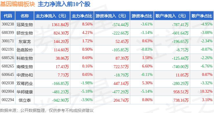 从资金流向上来看,当日基因编辑板块主力资金净流出2.06亿元,游资资金净流入1208.85万元,散户资金净流入1.94亿元。基因编辑板块个股资金流向见下表: