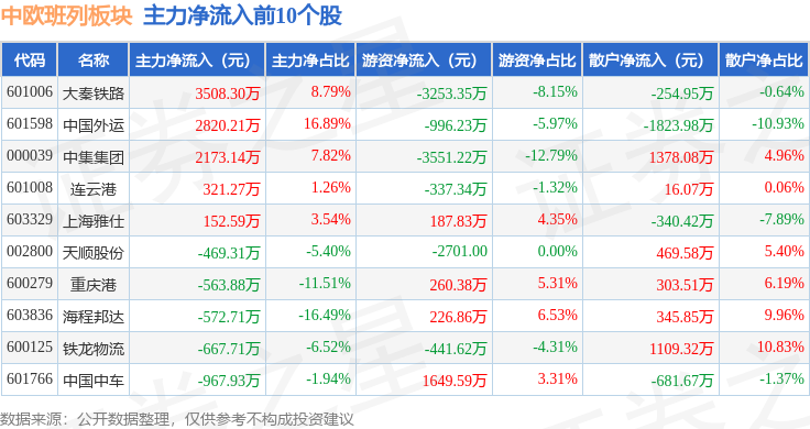 从资金流向上来看,当日中欧班列板块主力资金净流出2.94亿元,游资资金净流出6368.74万元,散户资金净流入3.57亿元。中欧班列板块个股资金流向见下表:
