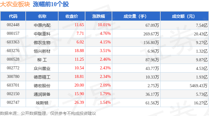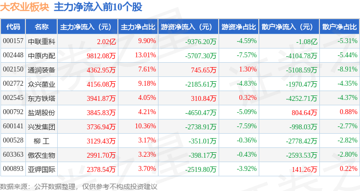 从资金流向上来看,当日大农业板块主力资金净流出25.5亿元,游资资金净流入3.03亿元,散户资金净流入22.47亿元。大农业板块个股资金流向见下表: