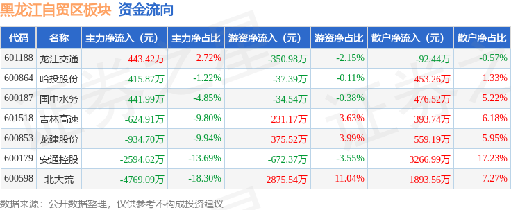 从资金流向上来看,当日黑龙江自贸区板块主力资金净流出9337.77万元,游资资金净流入2386.95万元,散户资金净流入6950.82万元。黑龙江自贸区板块个股资金流向见下表: