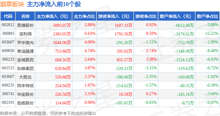 从资金流向上来看,当日烟草板块主力资金净流出3711.07万元,游资资金净流入7212.56万元,散户资金净流出3501.49万元。烟草板块个股资金流向见下表: