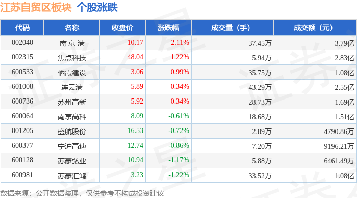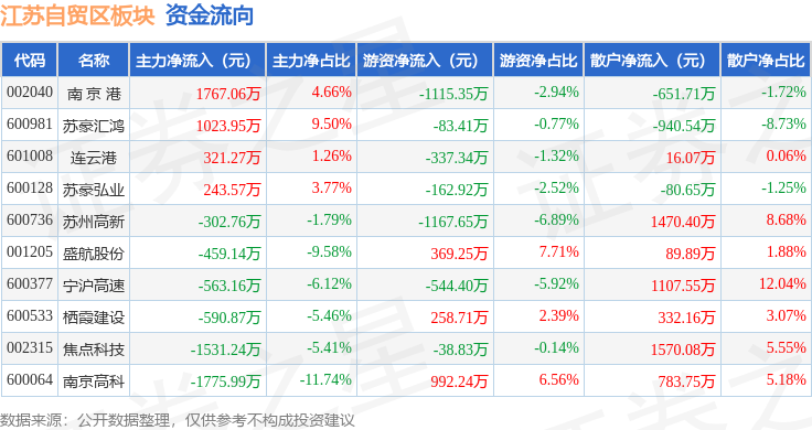从资金流向上来看,当日江苏自贸区板块主力资金净流出1867.31万元,游资资金净流出1829.71万元,散户资金净流入3697.02万元。江苏自贸区板块个股资金流向见下表:
