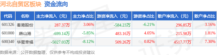 从资金流向上来看,当日河北自贸区板块主力资金净流出5438.8万元,游资资金净流入408.2万元,散户资金净流入5030.61万元。河北自贸区板块个股资金流向见下表: