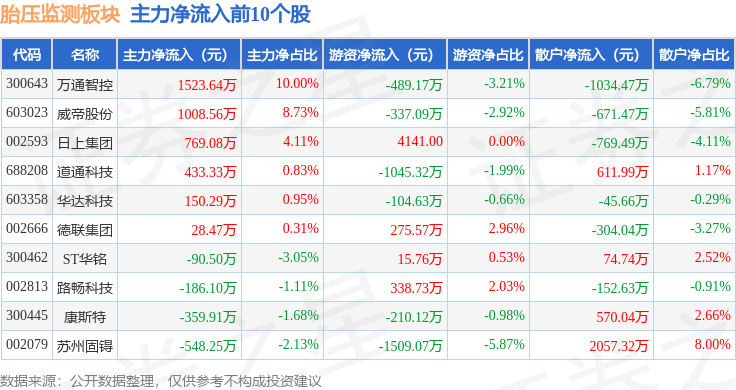 从资金流向上来看,当日胎压监测板块主力资金净流出3.76亿元,游资资金净流出9944.6万元,散户资金净流入4.76亿元。胎压监测板块个股资金流向见下表: