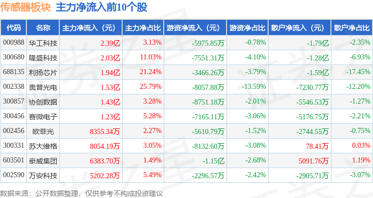 从资金流向上来看,当日传感器板块主力资金净流出17.67亿元,游资资金净流出5.04亿元,散户资金净流入22.71亿元。传感器板块个股资金流向见下表: