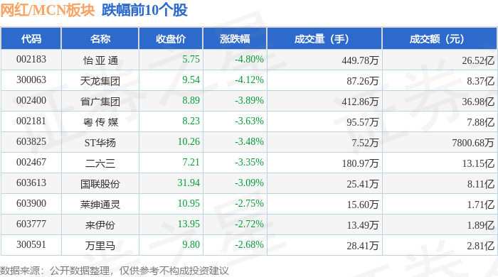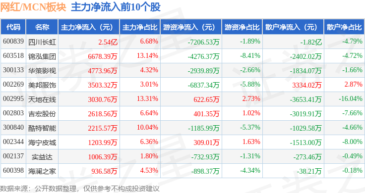 从资金流向上来看,当日网红/MCN板块主力资金净流出28.06亿元,游资资金净流入7.66亿元,散户资金净流入20.4亿元。网红/MCN板块个股资金流向见下表: