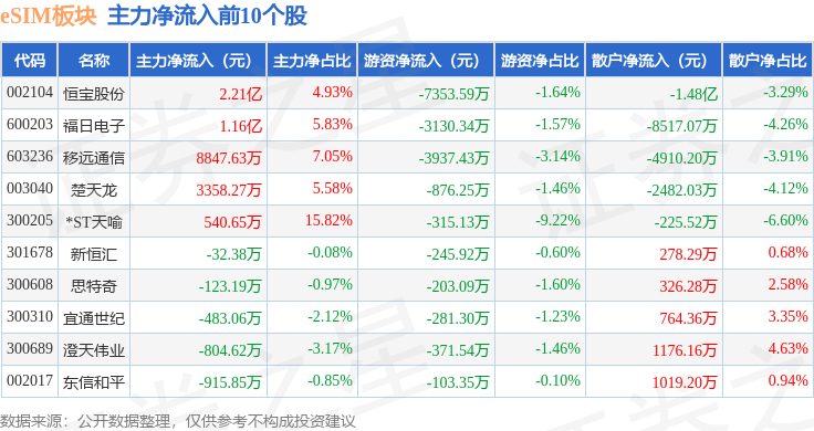 从资金流向上来看,当日eSIM板块主力资金净流入157.09万元,游资资金净流出6829.81万元,散户资金净流入6672.72万元。eSIM板块个股资金流向见下表: