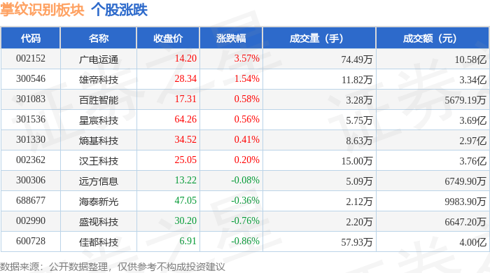 从资金流向上来看,当日掌纹识别板块主力资金净流入873.83万元,游资资金净流出7823.78万元,散户资金净流入6949.95万元。掌纹识别板块个股资金流向见下表: