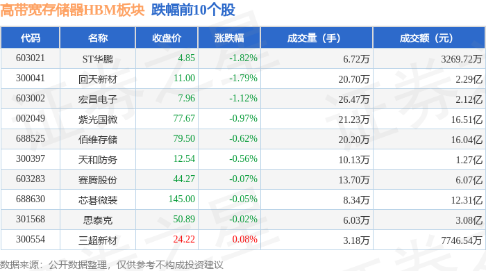 证券之星消息,9月17日高带宽存储器HBM板块较上一交易日上涨2.02%,精智达领涨。当日上证指数报收于3876.34,上涨0.37%。深证成指报收于13215.46,上涨1.16%。高带宽存储器HBM板块个股涨跌见下表: